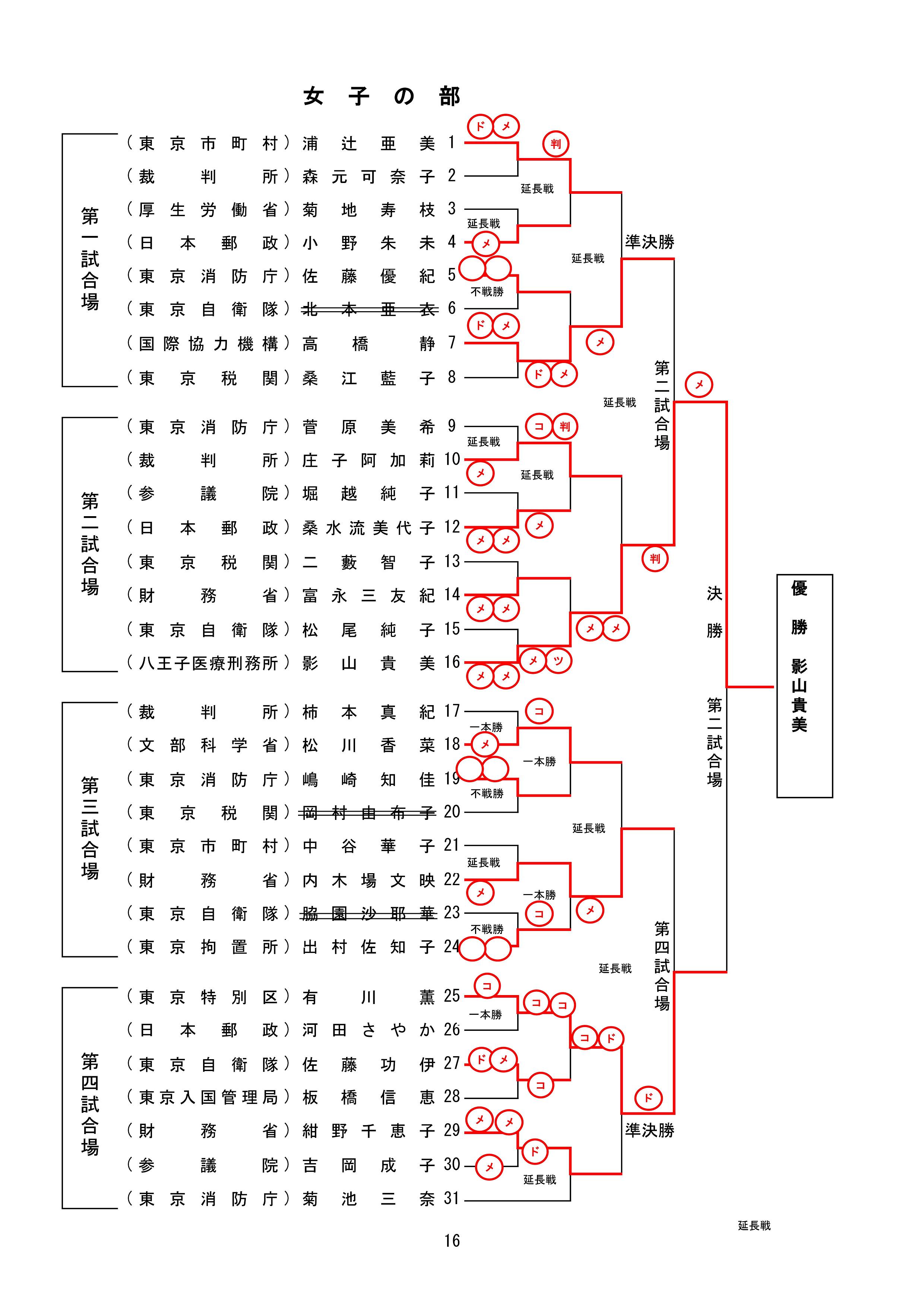 東京官公庁稽古会申込用紙ダウンロード 東京官公庁大会申込用紙ダウンロード ※各用紙のPDFファイルがダウンロードいただけます。印刷の上、郵送にてお送り下さい。 FAX : 04-7133-9770 官公庁剣道連盟事務局 ‥‥‥ 〒277-0831千葉県柏市根戸103-10-905 TEL / FAX : 04-7133-9770 info@kankoutyoukendo.org 官公庁剣道連盟 ホーム > 大会 > 平成26年度東京官公庁剣道連盟第50回剣道大会 個人戦 女子の部 結果 平成26年度東京官公庁剣道連盟第50回剣道大会 個人戦 女子の部 大会結果 優勝 景山 貴美 (八王子医療刑務所) 準優勝 有川 薫 (東京特別区) 三位 高橋 静 (国際協力機構) 内木場 文映 (財務省) トーナメント表 団体戦 結果 個人戦 四段以上の部 結果 個人戦 三段以下の部 結果